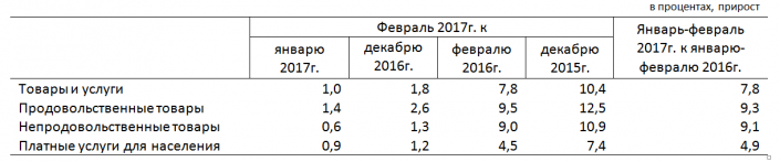 Цены на продовольственные товары за два месяца 2017 года (февраль 2017 года к декабрю 2016 года) увеличились на 2,6 процента, на непродовольственные товары - на 1,3 процента, на платные услуги - на 1,2 процента.