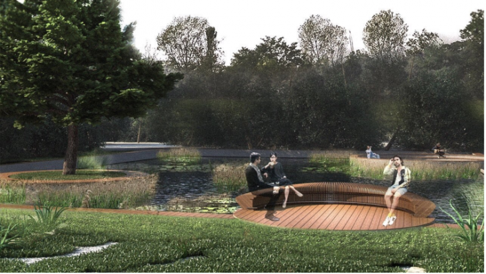 "Там есть большой пруд. Мы предлагаем сделать форму пруда с округлыми краями в восточном, узнаваемом стиле, который несет философию Востока. Сейчас там стоят большие деревья. Учитывая специфику, мы решили не трогать старые деревья", - рассказал представитель автора проекта.