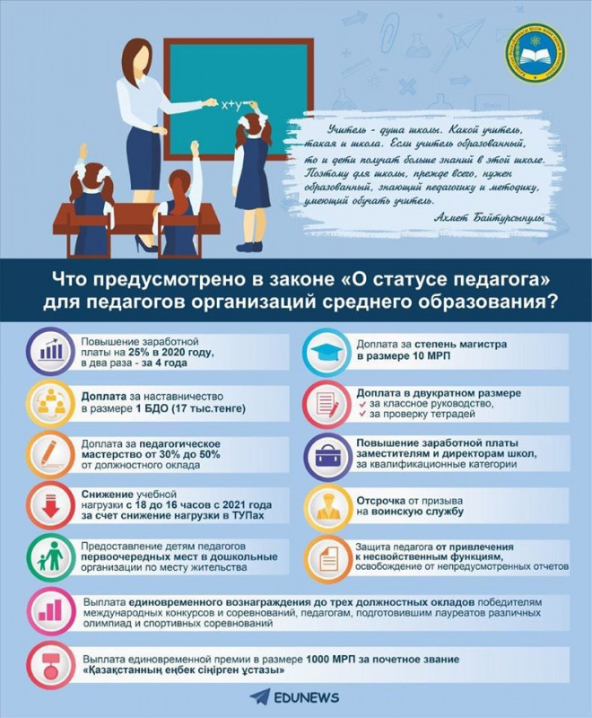 Кроме того, предусмотрены доплаты за степень магистра в размере 10 МРП, а также доплаты за классное руководство и проверку тетрадей. Также педагоги новым законом теперь защищены от привлечения к осуществлению несвойственных функций. Более подробно с нововведениями можно ознакомиться ниже.