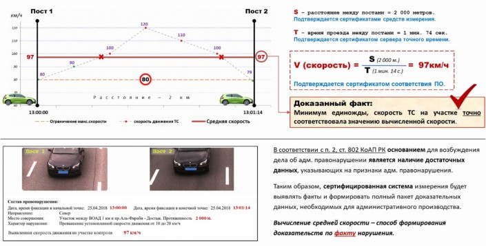 Среднюю скорость будут измерять во время проезда между постами. Для этого специалисты с помощью определенных инструментов замеряют расстояние между этими постами и время. Для этого есть свои расчеты. Например, при ограничении скорости 60 километров в час расстояние от точки А до точки В нужно проехать за 20 секунд. Если проехал быстрее (за 16 секунд), значит, допустил превышение скорости. Но расстояние между постами в разных частях города может быть разным. Поэтому время прохождения также может варьироваться.