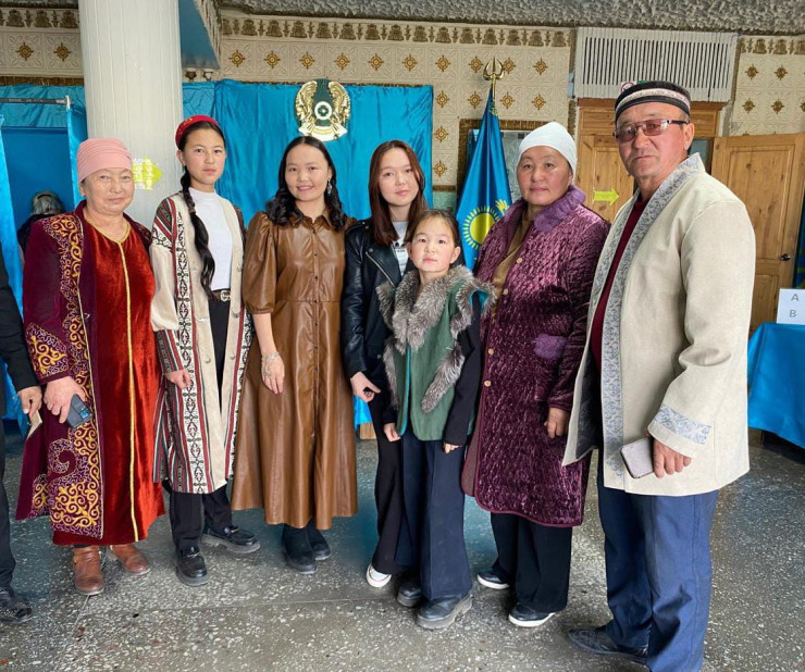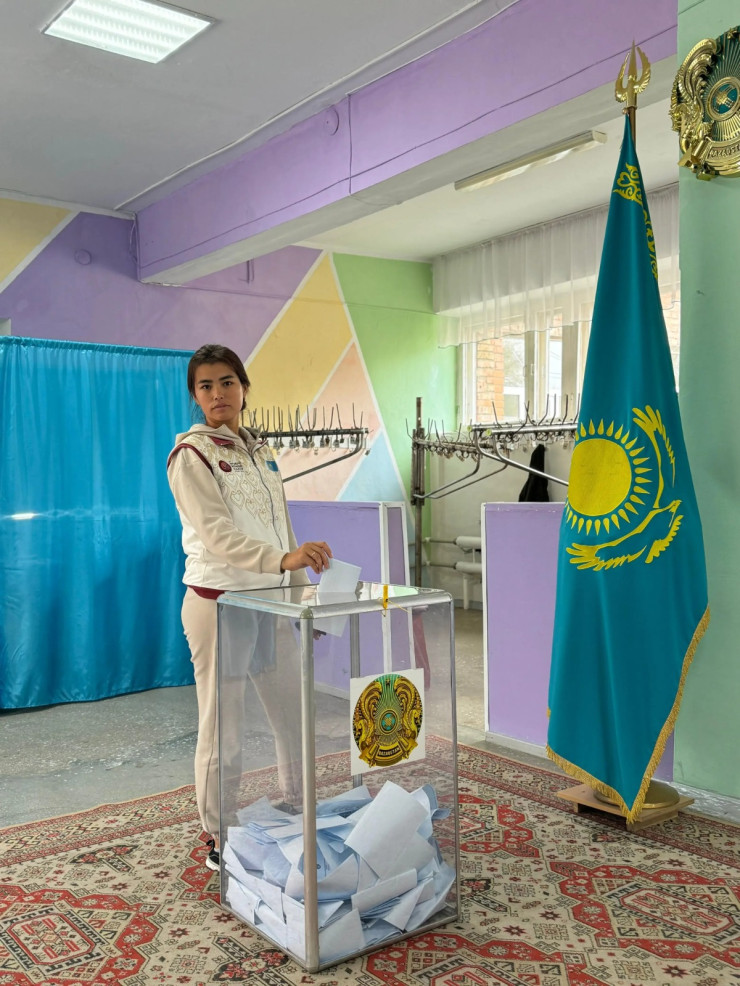 Известная лучница, серебрянная призерка Всемирных игр кочевников Ажар Толеуканова пришла голосовать на референдум со всей семьей.
