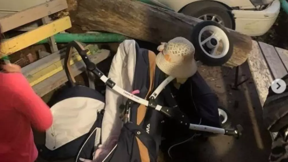 На кадрах видео, опубликованном в Instagram, видно, что автомобиль снес ограждение у подъезда одного из многоэтажных домов и повредил скамейку. Рядом с авто лежит перевернутая детская коляска.