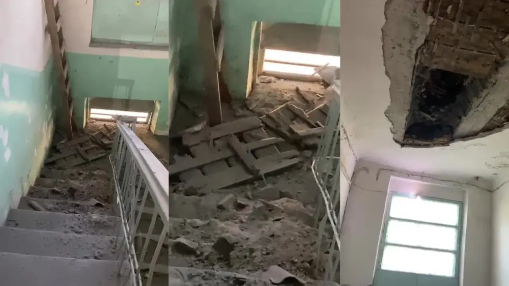 В Актобе кирпичи и куски штукатурки обрушились прямо на лестничную клетку двухэтажного дома. В потолке образовалась огромная дыра, из которой до сих пор сыплются обломки, передаёт корреспондент Tengrinews.kz.