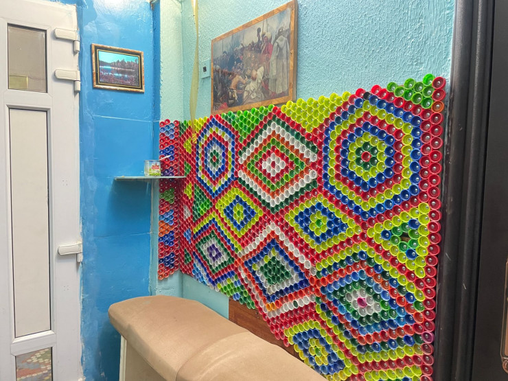 Пластмассовые крышки разных цветов он собирает у знакомых, друзей. В качестве раствора использует кафельный клей, цемент. При создании переносных картин сшивает их капроновыми нитями или леской.