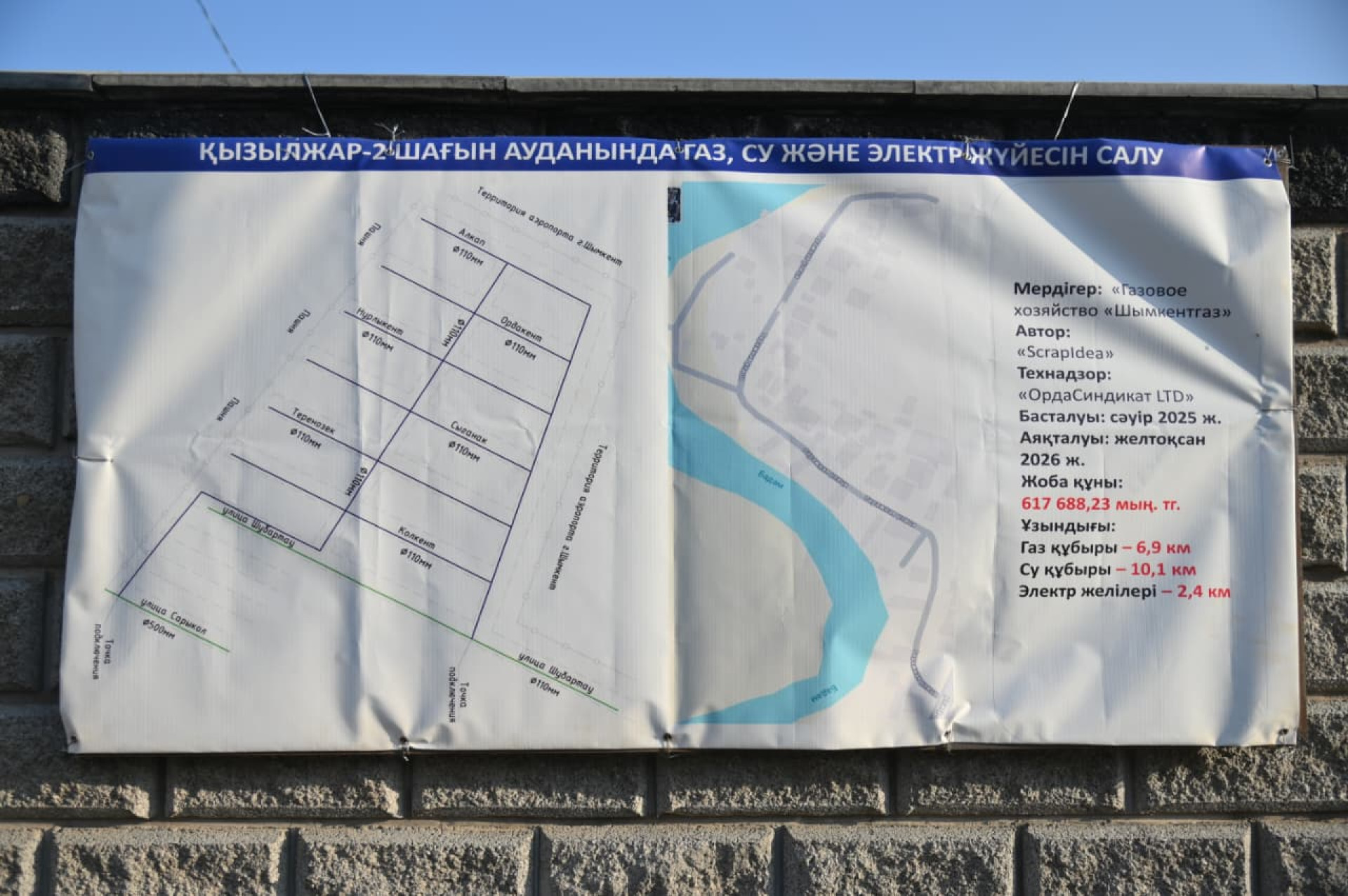 Градоначальник дал срочное поручение соответствующим структурам и поставил задачу в кратчайшие сроки обеспечить подведение коммуникационных сетей в микрорайон. Таким образом в апреле 2024 года началось строительство инженерных сетей на территории "Кызылжара-2". Проектные работы проводились на улицах Алкап, Ордакент, Нурлыкент, Сыганак, Теренозек и Колкент.