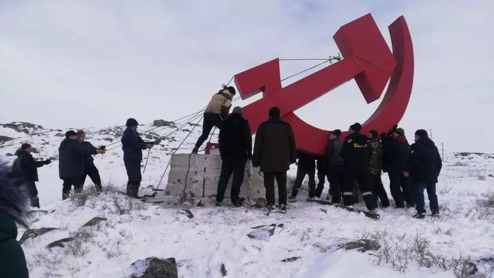 Громадные серп и молот были установлены 35 лет назад. Знак стоял на возвышенности и был виден издалека. Жители считали его символом поселка. Возле него выпускники местной школы встречали рассвет, у него фотографировались все приезжие, да и у местных жителей почти у каждого есть фото возле монумента.