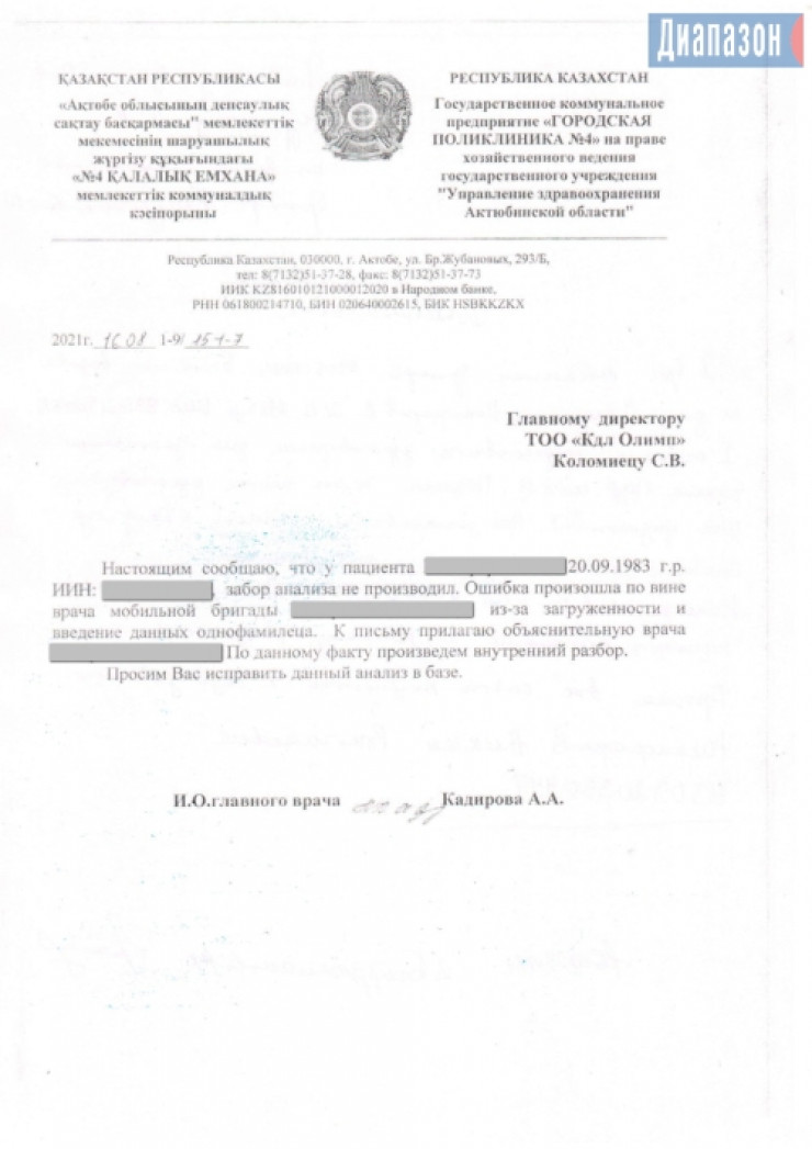 В своем письме в лабораторию исполняющий обязанности главврача поликлиники № 4 сообщил, что ошибка произошла по вине врача мобильной бригады из-за загруженности и введения данных однофамильца. По этому факту провели внутренний разбор. Алексей отметил, что в тот же день, когда узнал о своем статусе, сразу же обошел все организации. Но пока все безрезультатно.