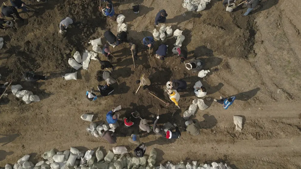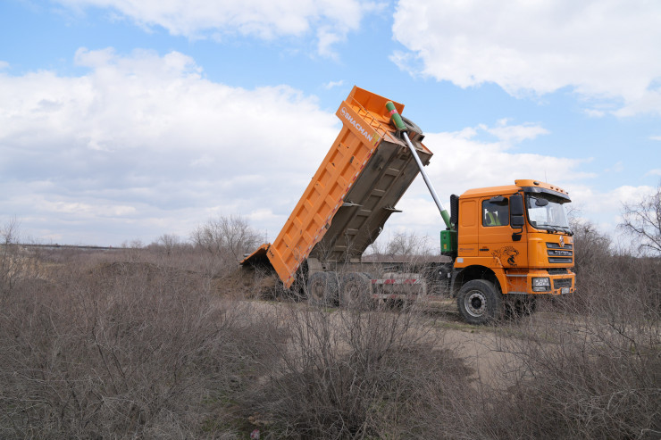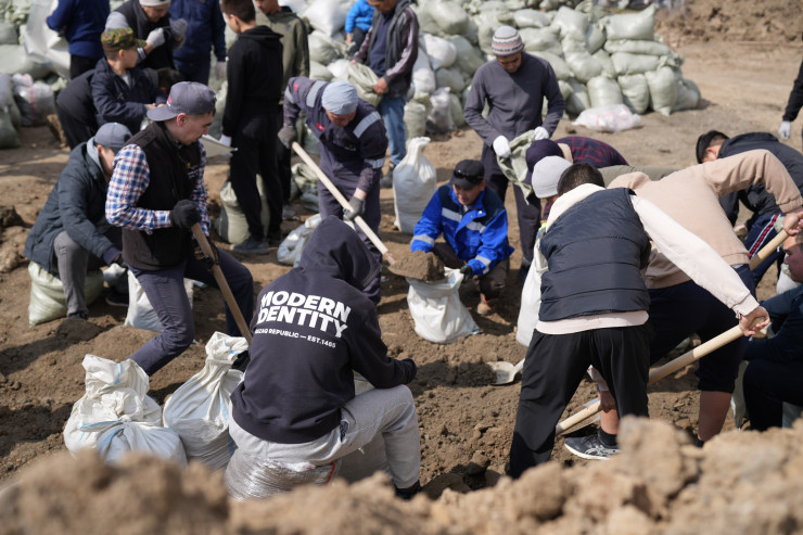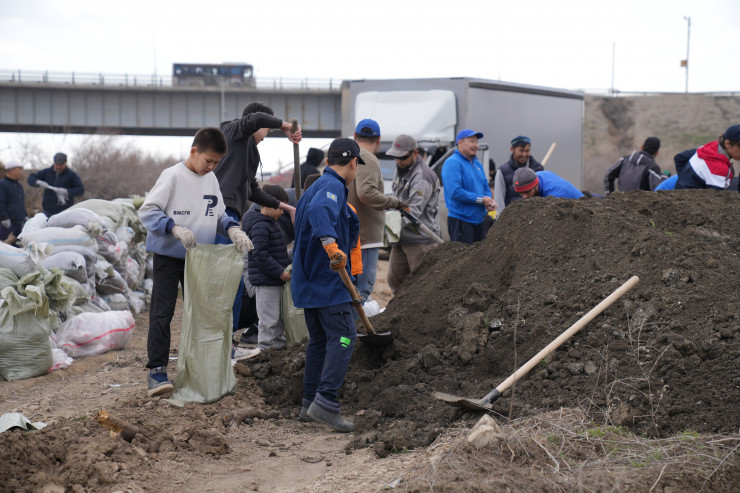 Төгілген топырақты темір техникамен таптап, бөгет бекітіліп жатыр. Оның үстінен мөшек-мөшек құм тастайды. Қарашаның қолынан келген қорғанудың жалғыз тәсілі – осы. Ел үшін жасалған игі істің басы қасында балалар да бар.