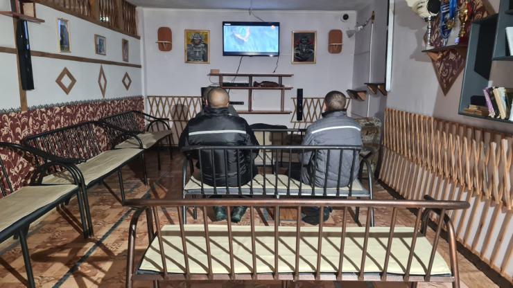 Проходим в комнату, где установлен телевизор. Трое осужденных смотрели фильм, не обращая внимания на необычных посетителей.