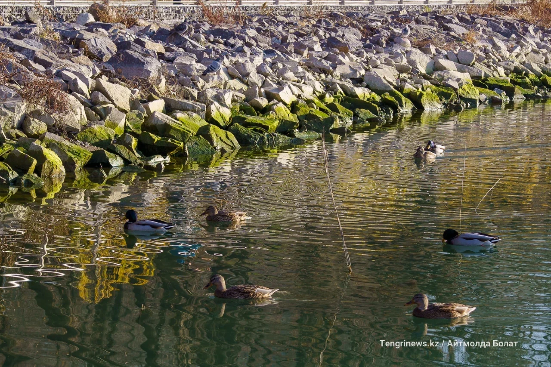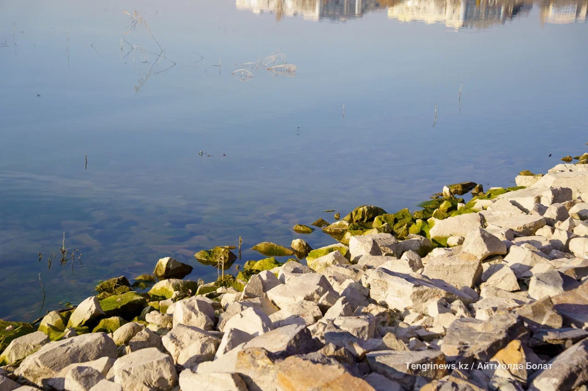Корреспондент Tengrinews.kz, выехавшая на место, также увидела зелёный налёт на камнях, о котором говорят жители. При этом на поверхности водоёма плавала стая уток - судя по всему, часть экосистемы остаётся активной, хотя местные жители продолжают отмечать неприятный запах и изменившийся цвет воды.