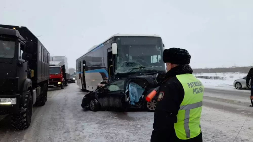 "36-летний водитель автомашины марки Toyota Yaris, следуя по трассе Нур-Султан - Караганда, не справившись с рулевым управлением, выехала на полосу встречного движения и допустила столкновение с маршрутным автобусом марки Irisbus Crossway. В результате ДТП водитель автомашины марки Toyota Yaris от полученных травм скончалась на месте происшествия. Пассажиры автобуса не пострадали. По данному факту возбуждено уголовное дело", - сообщили в полиции города.