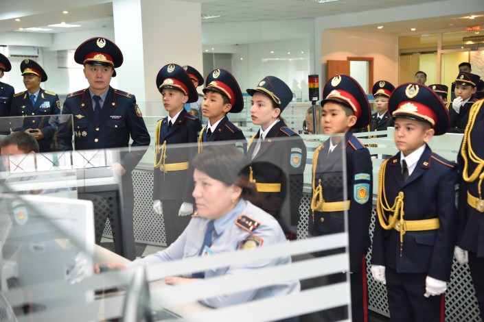 Школьники показали руководству министерства свои навыки по строевой подготовке и умения по разборке и сборке автомата, а также выступили с концертной программой, исполнив для полицейских песни "Мәңгілік ел", "Нұр аға" и другие концертные номера.
