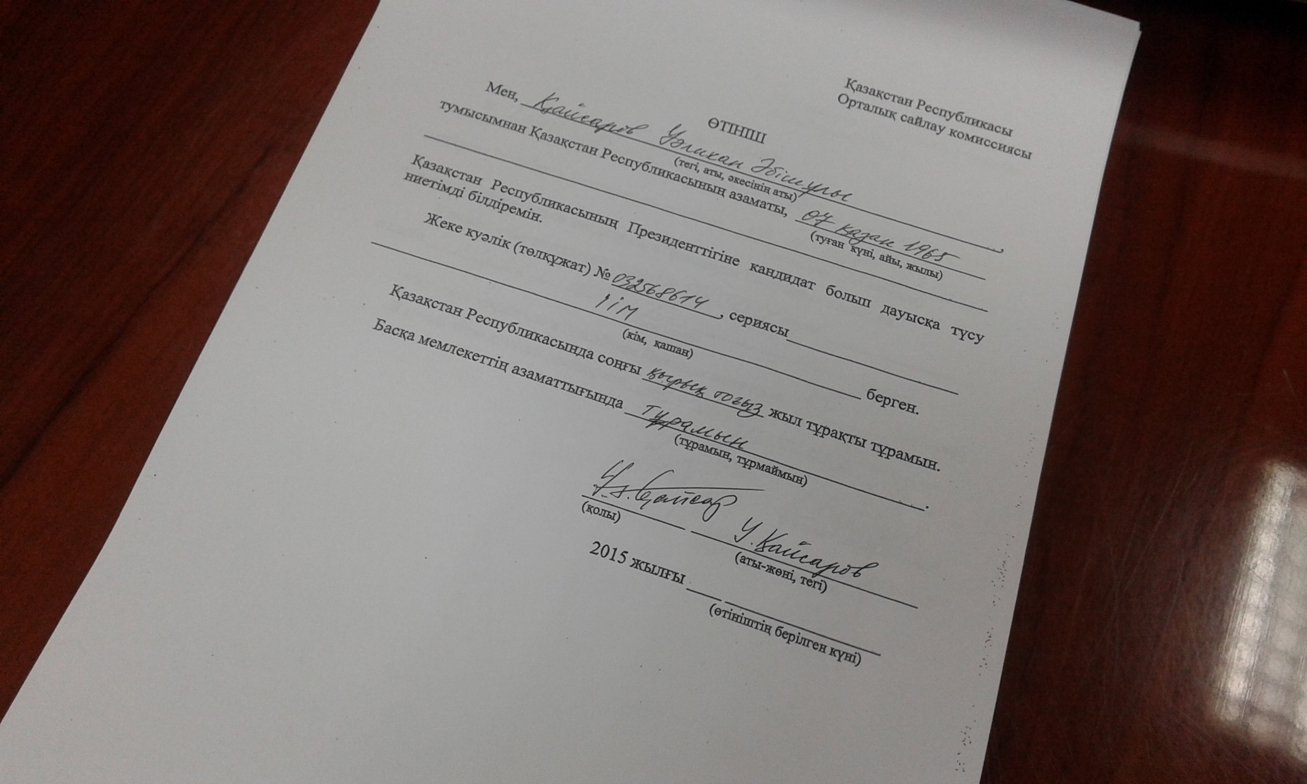 "Я никак не мог написать, что я гражданин другого государства, потому что я гражданин Казахстана по рождению (...). В заявлении написано: сколько лет Вы являетесь гражданином Казахстана? Я указал, что я 49 лет являюсь гражданином Казахстана. Попросили указать домашний адрес, я указал домашний адрес вплоть до квартиры. (...) Если бы я написал в двух местах, что я не гражданин Казахстана, в чем я сомневаюсь (...). Поэтому я попросил показать мое заявление, хочу собственными глазами увидеть", - сказал Кайсаров журналистам. По крайней мере, такое его заявление выглядит странным, поскольку он собственноручно написал заявление.