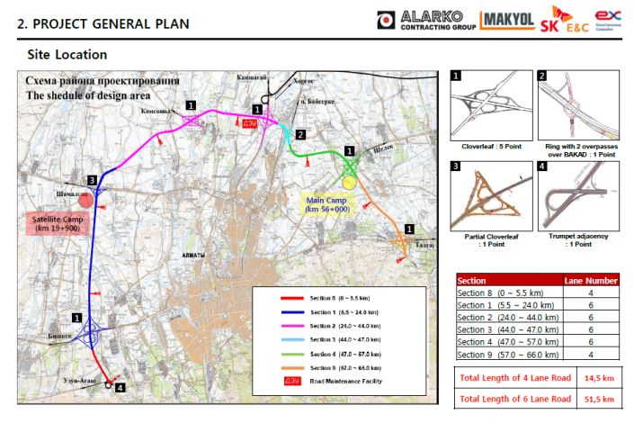 Протяженность трассы составит 66 километров. В строительстве будет задействовано 2 150 сотрудников. Согласно генеральному плану, предусмотрено пять развязок в виде листа клевера (на плане отмечены цифрой 1), одна кольцевая (2), одна "полуклеверная" и одна в виде тромбона (музыкальной трубы) (4).