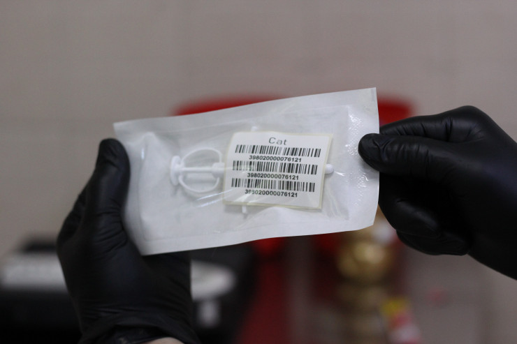 Перед тем как приступить к процедуре чипирования, ветеринар осматривает "пациента". Уже после этого достает микрочип, который представляет собой стерильно упакованный шприц-дозатор с микрочипом и штрихкодами.