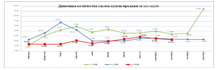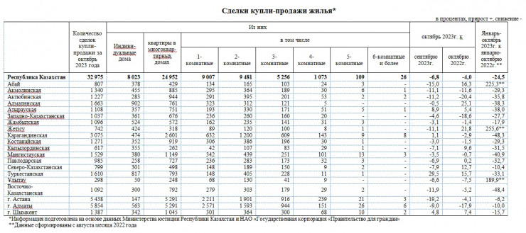 Количество сделок купли-продажи жилья за октябрь 2023 года по сравнению с соответствующим месяцем прошлого года уменьшилось на 4 процента, тогда было зарегистрировано 34 336 сделок. Отрицательный наивысший показатель был зарегистрирован в Актюбинской области (20,4 процента), а самое большое увеличение зафиксировано в Алматинской области (на 25,1 процента). Вместе с тем уменьшение в динамике наблюдается в количестве сделок января-октября 2023-го к январю-октябрю 2022-го и составляет 24,5 процента.