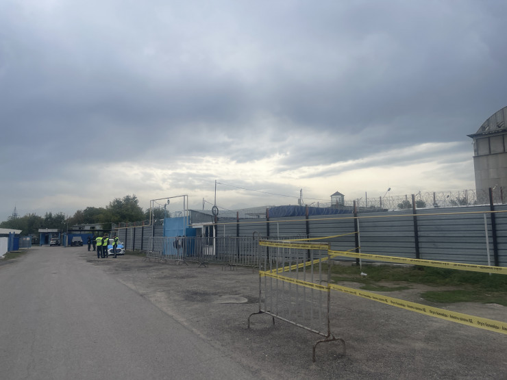 Забор учреждения хоть и обвешан колючей проволокой, но дополнительно огорожен предупреждающей полицейской лентой.