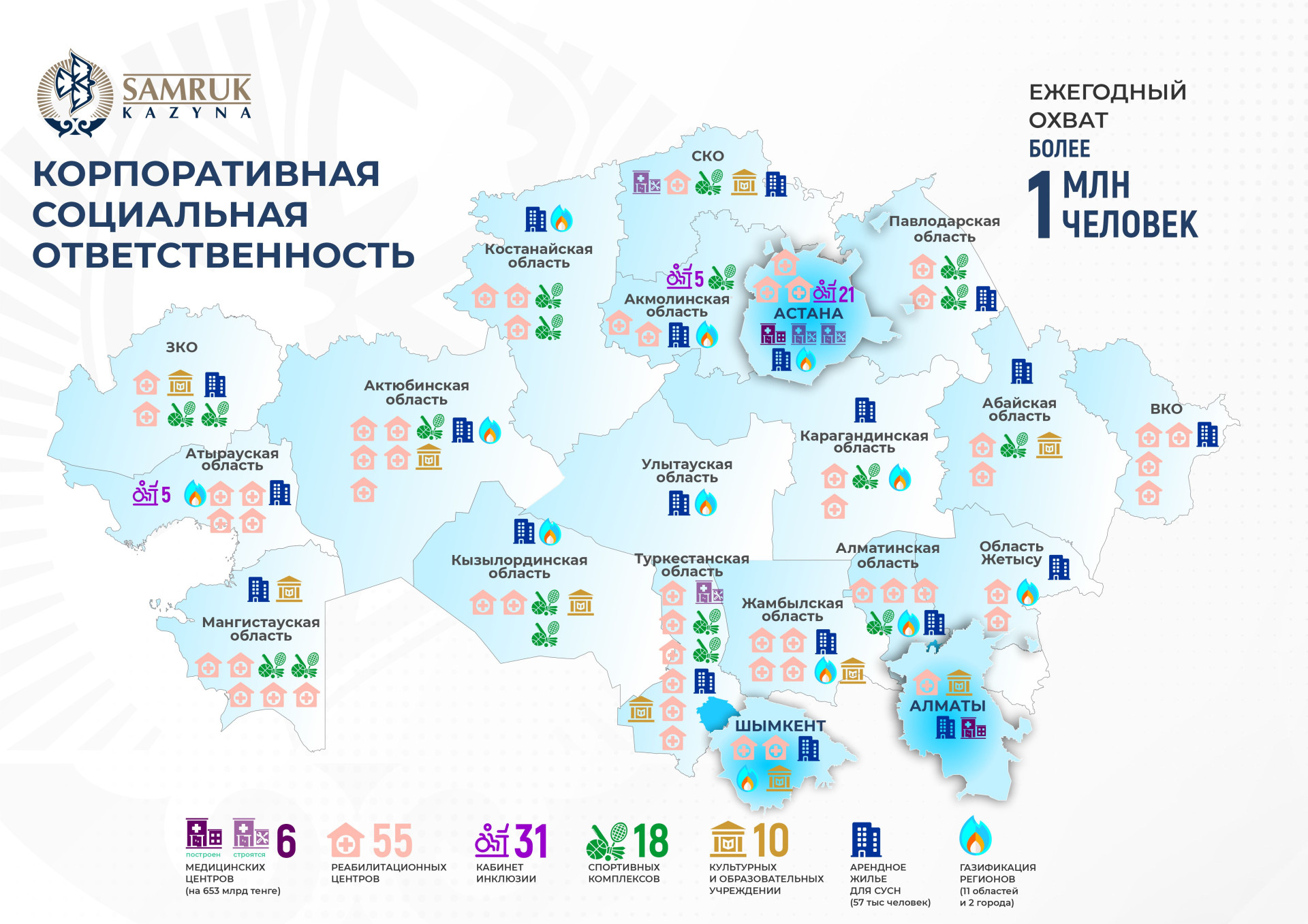 Реабилитационные центры для особенных детей, инклюзивные классы в школах, новые спортзалы в регионах и врачи, приезжающие в самые отдалённые аулы. Все это — часть социальных программ, которые АО "Самрук-Қазына" реализует через фонд Samruk-Kazyna Trust.