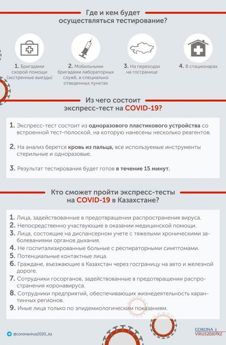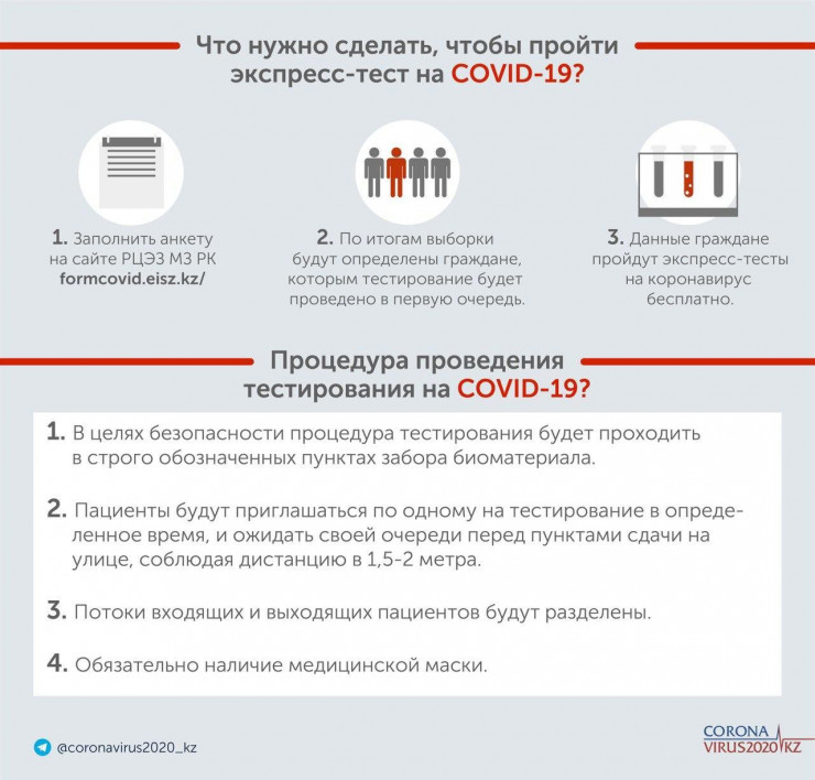 Для того чтобы пройти экспресс-тесты на коронавирус, нужно заполнить анкету на сайте formcovid.eisz.kz. Далее будет определены те люди, которым тестирование будет проведено в первую очередь.