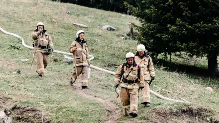 На участке у склона "Горельника", по словам корреспондента, работают 60 пожарных с водным рюкзаком по 20 литров. Они поднимаются на склон.