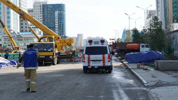 К 11 часам утра к строящемуся объекту съехались пожарные машины. Здесь уже был выстроен отряд спасателей. Служба пожаротушения и аварийно-спасательных работ столичного ДЧС устроила учения. Два года назад у этого объекта можно было увидеть почти такое же скопление пожарных и машин. Но тогда тушили реальный пожар на 25-м этаже. Сегодня условное возгорание ликвидируют на 33-м.