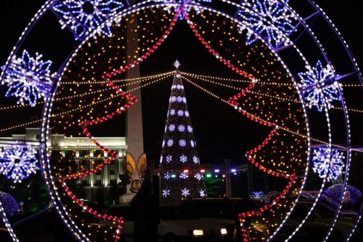 Новую 20-метровую ель установили по традиции на центральной площади Независимости, перед областным акиматом. Ее зажгли 25 декабря.