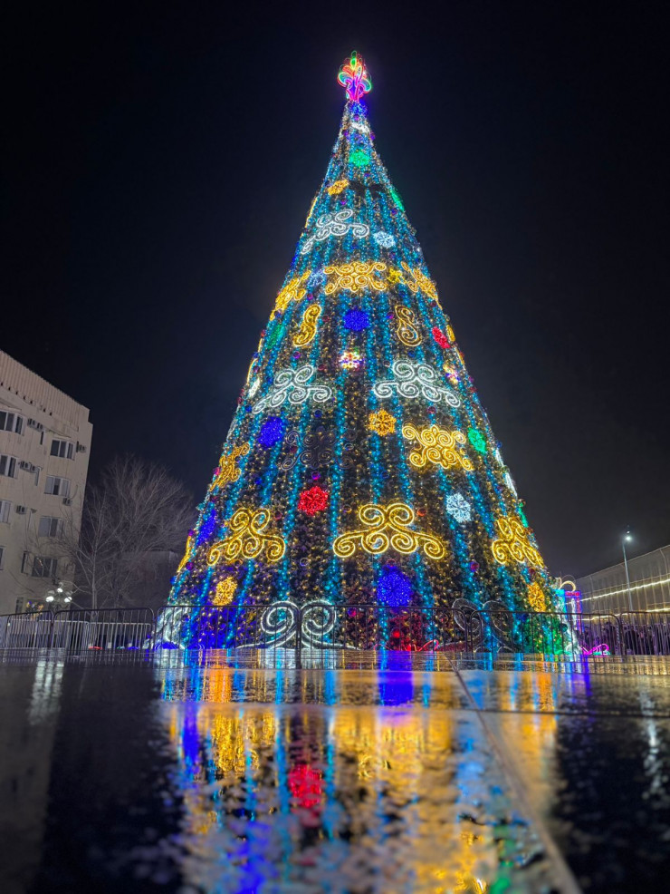 Новую 20-метровую ель установили по традиции на центральной площади Независимости, перед областным акиматом. Ее зажгли 25 декабря.
