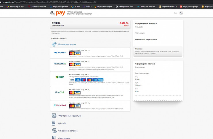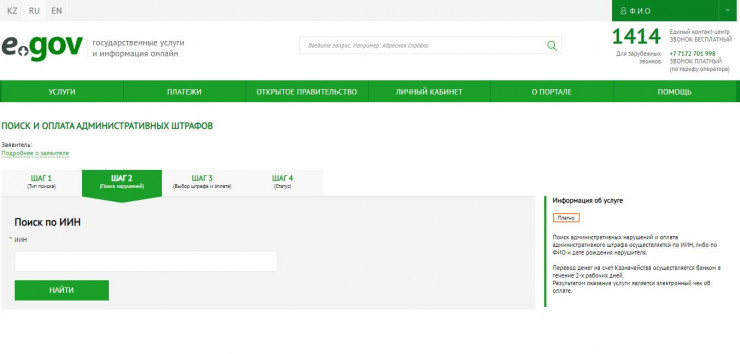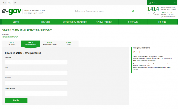 Затем нажать на кнопку "Оплатить онлайн" и выбрать тип поиска: по ИИН либо по фамилии, имени, отчеству и дате рождения.