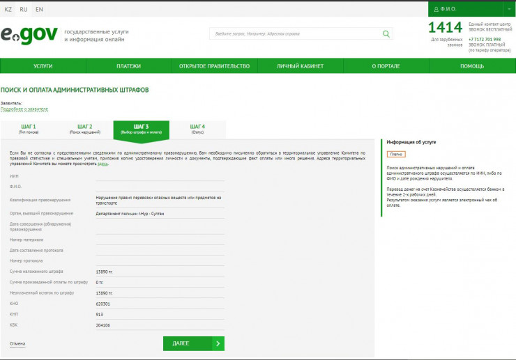 Для уплаты штрафа необходимо нажать кнопку "Далее".