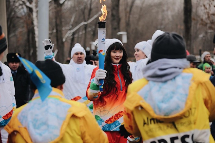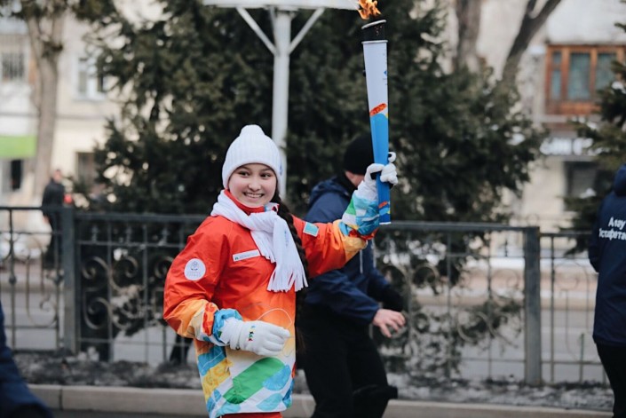 Среди спортсменов факелоносцем стала юная Жансая Абдумалик, на счету которой многочисленное количество побед на шахматных турнирах.