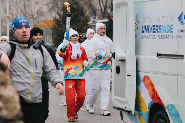 Сотни известных и почетных людей пронесли огонь Универсиады-2017 по улицам Алматы, передают Vesti.kz.