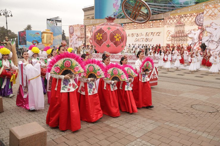 В шествии также участвовали артисты в образах и с символами различных народов, проживающих на территории Казахстана.