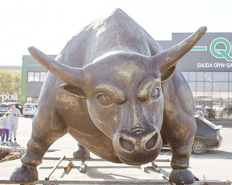 Атырауский бык напоминает знаменитую скульптуру Charging Bull (Бросающий вызов бык), установленную в Нью-Йорке на Уолл-стрит. Американская скульптура ассоциируется с ростом рынка.
