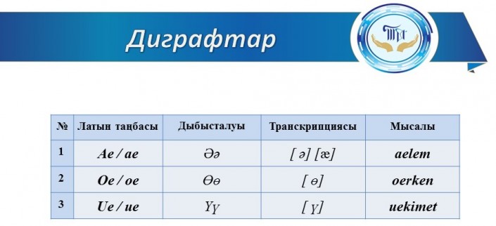 "Три казахских гласных фонемы - это мягкие "ә", "ө", "ү", обозначаются диграфами. Например, звук "е" в сочетаниями с твердыми гласными звуками "а", "о" , "u" дают звуки "ә" , "ө", "ү". Диграф "ае" обозначает букву "ә". Мы выбрали такое обозначение для передачи гласных звонких звуков.