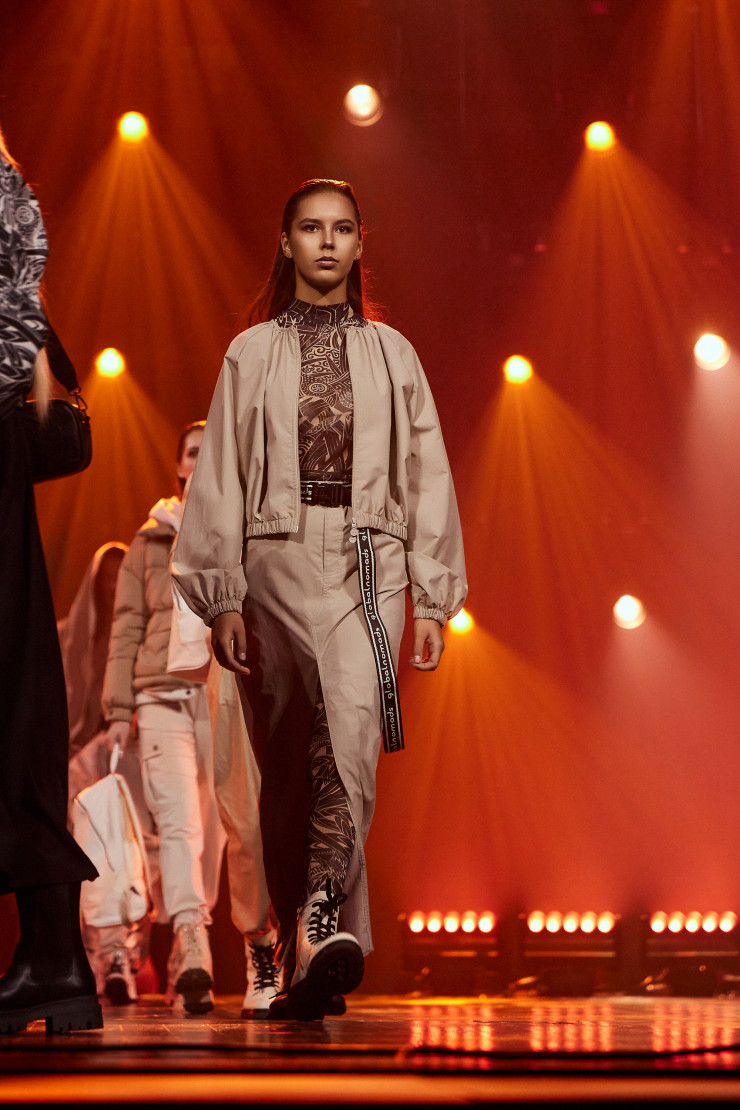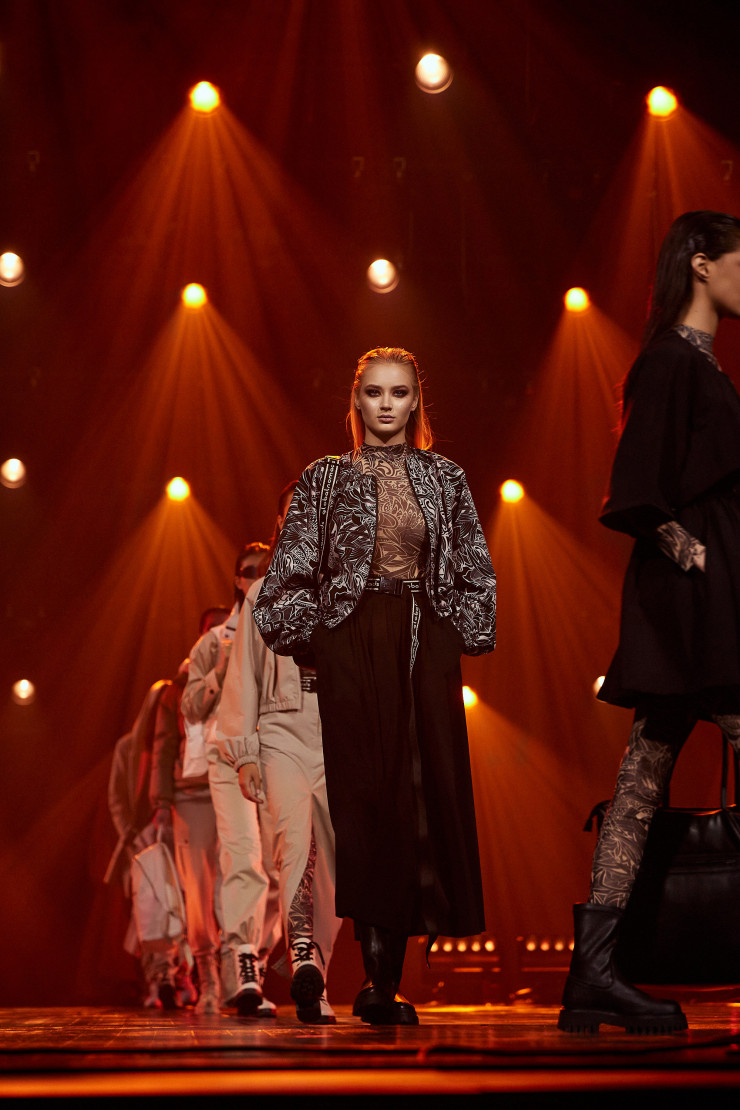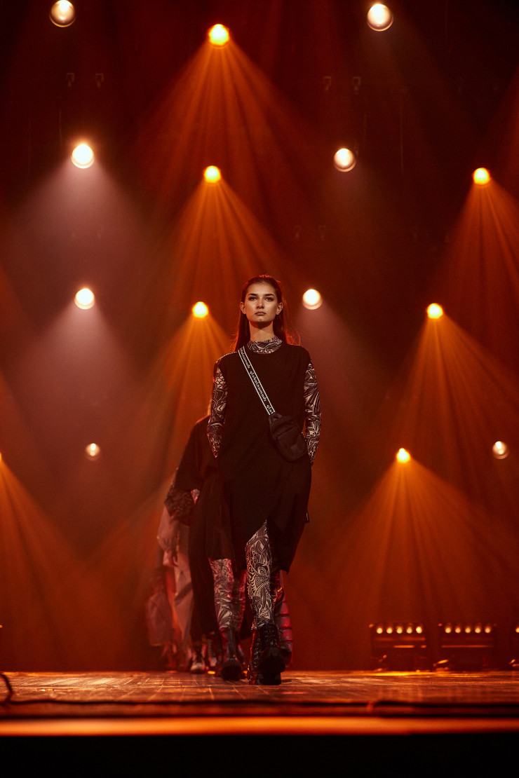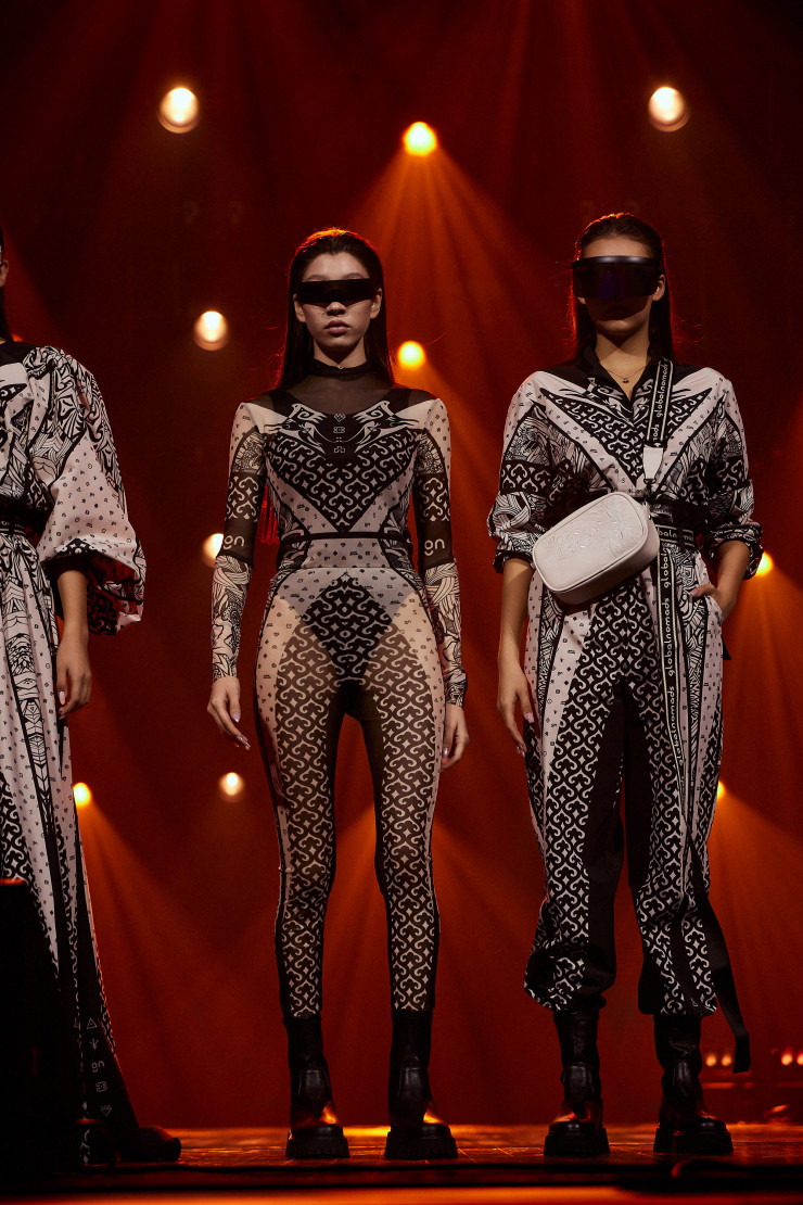 Яркий, узнаваемый акцент коллекции – фирменные принты-"татуировки", использованные на комбинезонах, платьях, водолазках и легинсах из полупрозрачной силиконовой сетки. Этот принт носит символическое название - "Тень Самрука, парящего над степью", он был создан на основе национальных казахских орнаментов, петроглифов и реальных татуировок сакских воинов 1-го тысячелетия до нашей эры. В коллекцию также вошли конструктивистские мантии косого кроя с капюшоном. Их прообразом стал клобук – одежда воинов-кочевников, сведения о которой были обнаружены в средневековых летописях.