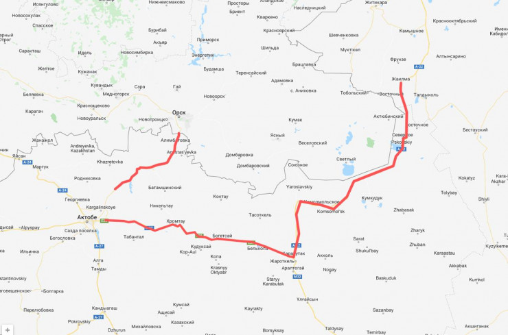 - с 19.30 Карабутак - Комсомольское - Денисовка - Рудный - Костанай, километры 0-234, участок от поселка Карабутак до границы Костанайской области.