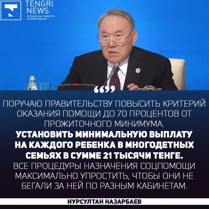"Особенно считаю необходимым усилить меры поддержки нашим многодетным семьям. Сегодня в стране порядка 340 тысяч семей имеют более четырех детей. Ежегодно на поддержку семей с детьми выделяется более 500 миллиардов тенге. Эти семьи имеют разный уровень дохода. Поэтому в первую очередь государство особую заботу и внимание должно проявить к многодетным семьям с низкими доходами. В настоящее время адресную социальную помощь от государства получают более 111 тысяч семей (571,6 тысячи человек). Поручаю правительству для расширения охвата малообеспеченных семей, особенно многодетных, повысить критерий оказания адресной помощи до 70 процентов от прожиточного минимума (с 14 849 тенге до 20 789 тенге, прожиточный минимум – 29 698 тенге).