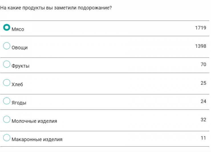 Согласно его результатам, больше всего в Казахстане подорожало мясо. За этот вариант ответа проголосовали 47 процентов опрошенных.