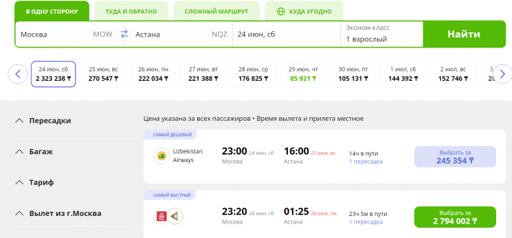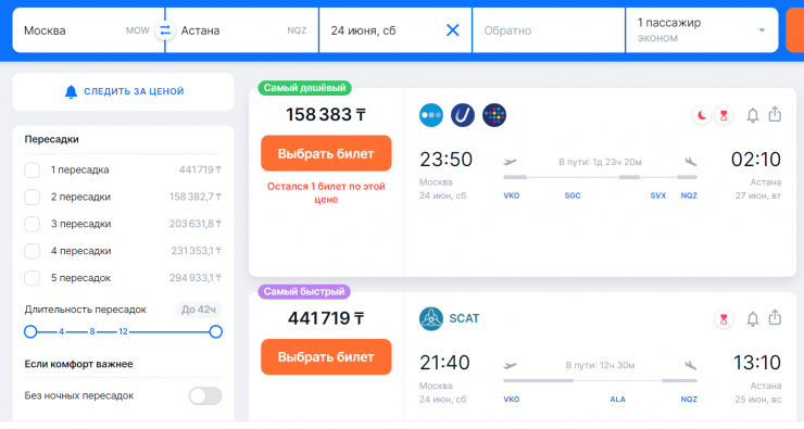 Как показывает поиск авиабилетов, билетов из российской столицы в казахстанскую на 24 июня, субботу, осталось всего несколько. Стоимость билетов в одну сторону с пересадкой стартует от 441 тысячи тенге.