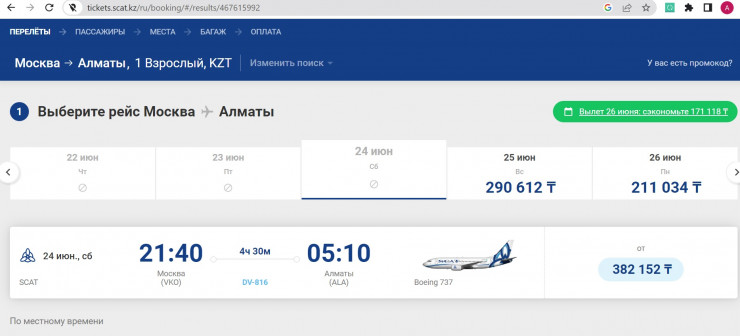 Стоит отметить, что на последующие даты, до конца июня, билеты из Москвы доступны. Цены на них начинаются от 169 тысяч тенге.