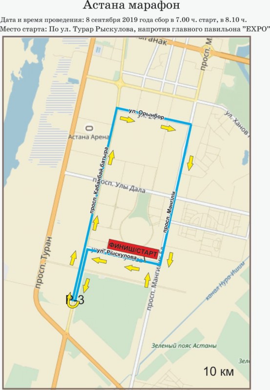 Маршрут дистанции на 10 километров будет пролегать через улицу Рыскулова - проспект Кабанбай батыра - улицу Орынбор - проспект Мангилик ел - улицу Рыскулова.