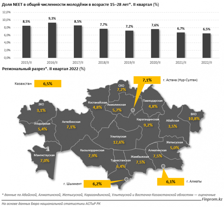 Среди регионов страны наибольшая доля молодежи NEET во втором квартале 2022 года, по оценочным данным, была зафиксирована в Улытауской области: сразу 12,6 процента. Следом идут Восточно-Казахстанская (10,8 процента) и Карагандинская область (9,2 процента).