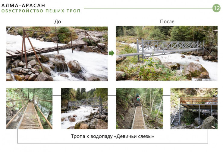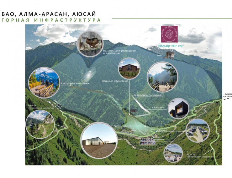 "Рассматриваем вариант туалета - будет ли он платный или нет. Чуть позже откроем музейную экспозицию, посвященную снежному барсу. Также появятся кемпинги. По контракту есть места для организации беседок, где разрешается делать барбекю. Однако наша главная цель - оторвать посетителей от реки, шашлыка и пива. Нужно дать, в первую очередь, возможность пройти пешком по нормальному маршруту, где есть навигация с понятными табличками. Мы изменим профиль трассы, не меняя профиль ландшафта", - пояснил Гужавин.