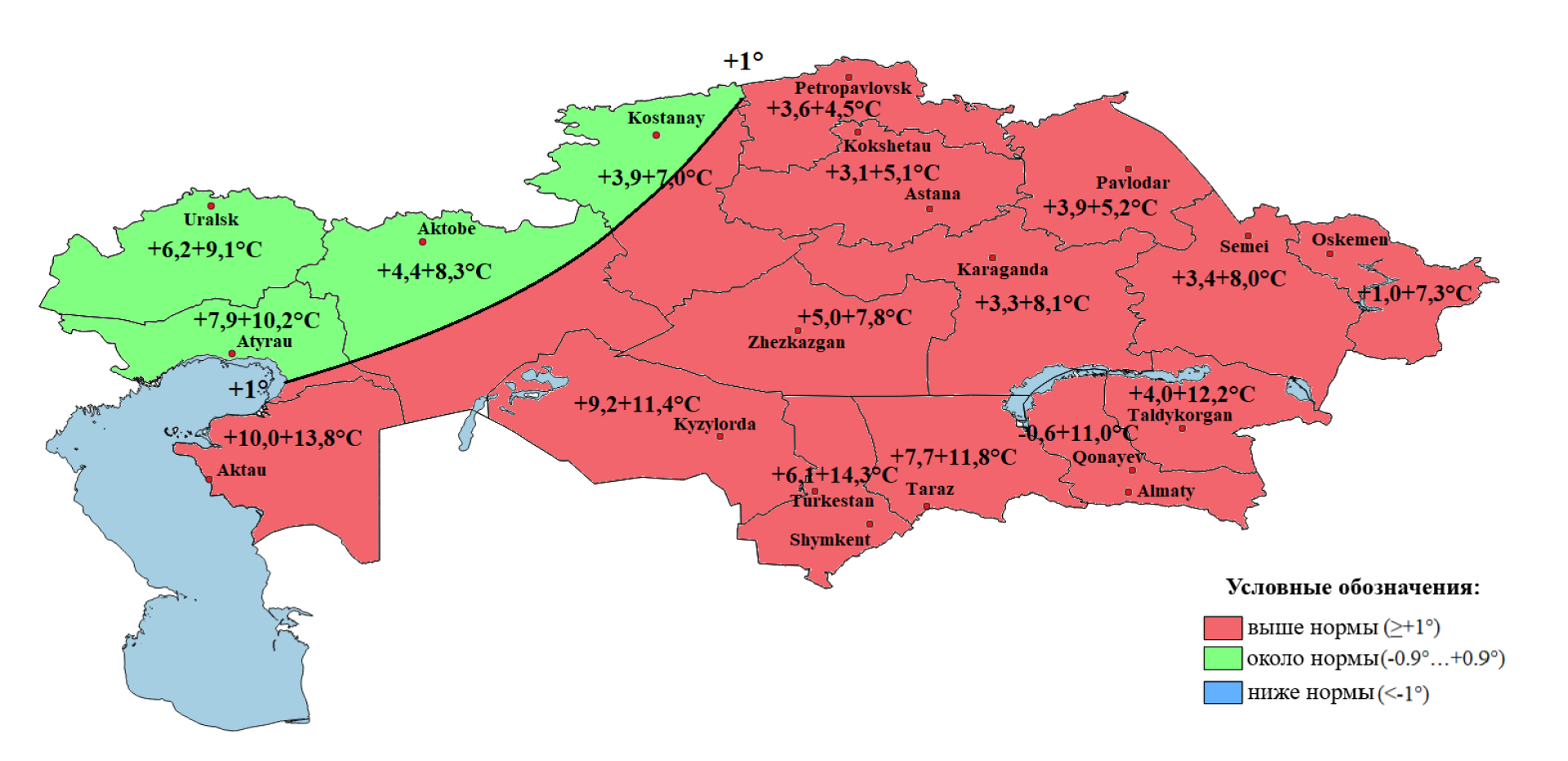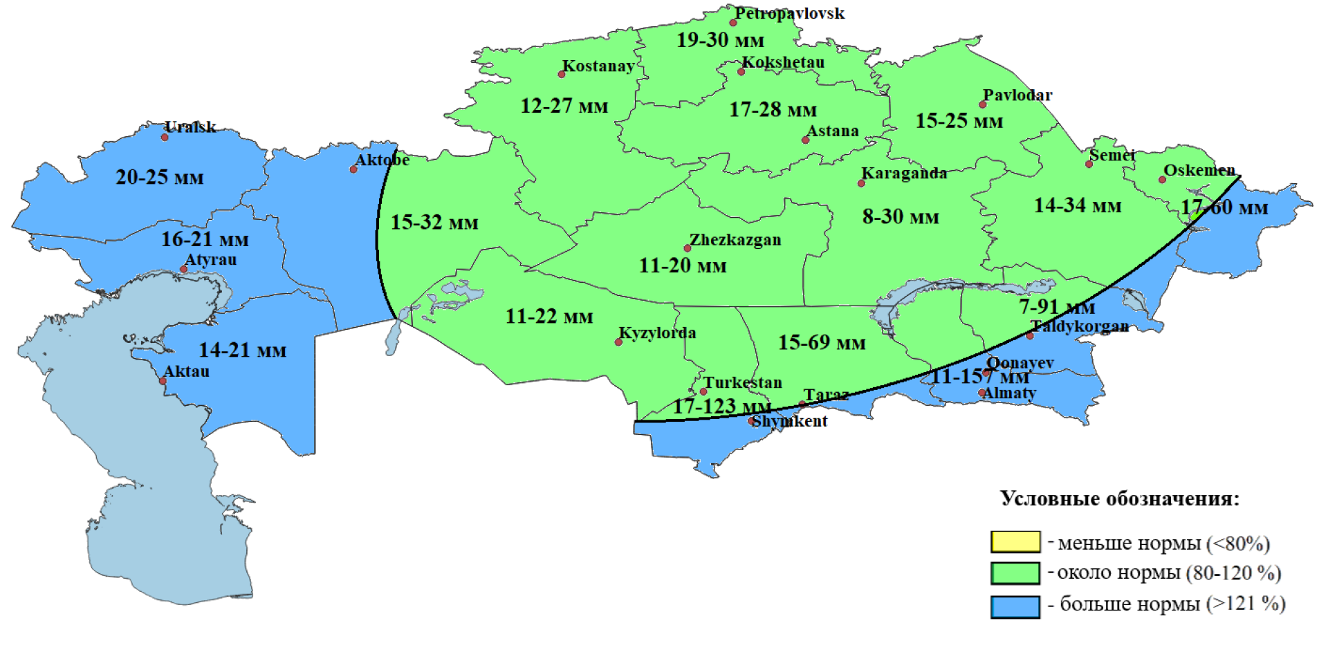 - меньше нормы — в северных регионах (Костанайская, СКО, Акмолинская), а также частично в западных и центральных областях.
