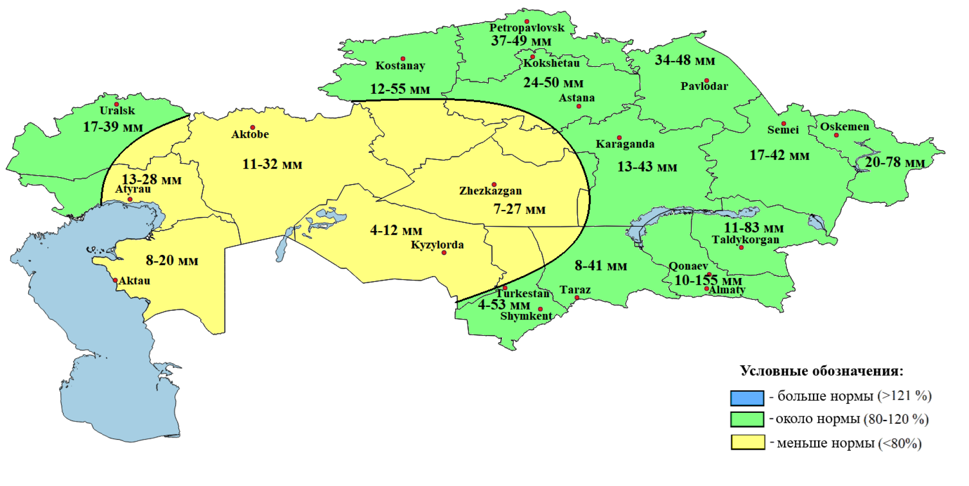 - но ниже нормы — в Мангистауской, Актюбинской, Кызылординской областях, а также частично в Атырауской и ряде центральных регионов.