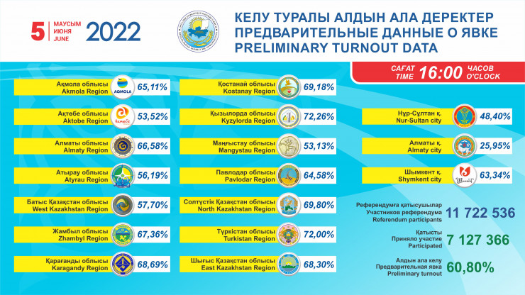 "Согласно данным, представленным Центральной комиссии референдума из территориальных комиссий областей, городов республиканского значения, столицы, по состоянию на 16.00 часов по времени столицы бюллетени для голосования получили 60,80 процента от общего числа граждан, включенных в списки", - сообщил Смагулов.