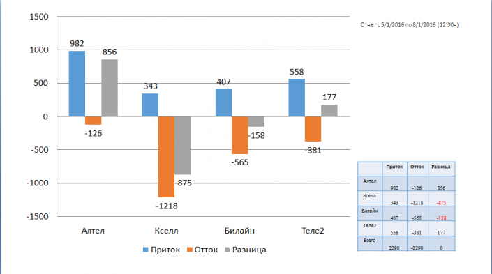 Отвечая на запрос Tengrinews.kz, в комитете пояснили, что по состоянию на 12:30 8 января 2016 года наибольший приток абонентов у Altel (982 человека), на втором месте - Tele2 (558 человек), третье место у Beeline (407 человек), четвертое - Kcell (343 человека).