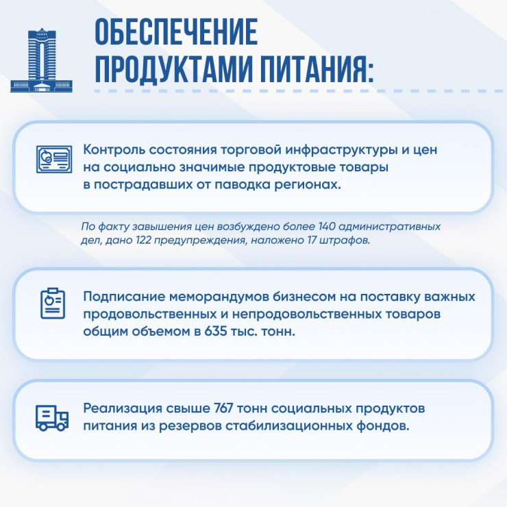 в 10 регионах, пострадавших от паводков, цены на социально значимые продукты питания находятся на ежедневном контроле. Созданы "горячие линии" для обращений граждан, открыты пункты общественного контроля. Субъекты бизнеса подписали меморандумы на поставку наиболее важных продовольственных и непродовольственных товаров общим объемом 635 тысяч тонн. Из резервов стабфондов реализовано около 767 тонн социальных продуктов питания. По факту завышения цен на СЗПТ в 10 пострадавших регионах возбуждено более 140 административных дел, дано 122 предупреждения, наложено 17 штрафов.