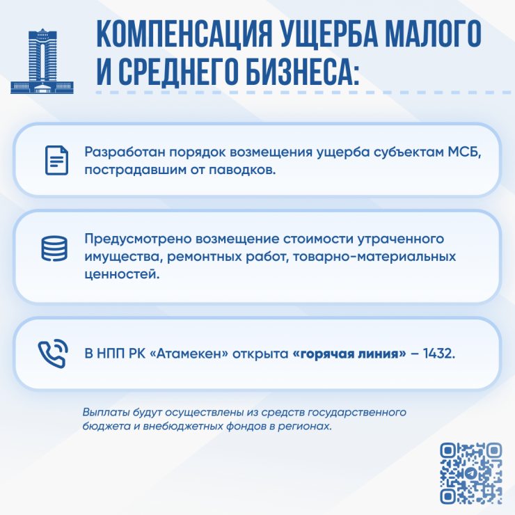 - всем пострадавшим индивидуальным предпринимателям, а также субъектам малого и среднего бизнеса, у которых из-за паводков нарушилась хозяйственная деятельность, будет предоставлена отсрочка платежей по кредитам с учетом поданного ими заявления (необходимо обратиться в акимат или в банк напрямую);