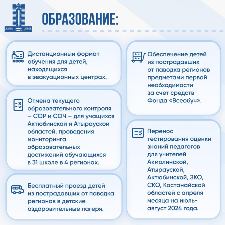 - дети и их родители, находившиеся в эвакуационных пунктах, размещены в летние лагеря, общежития, интернаты при школах, с организацией учебного процесса. 600 детей направлены в детские оздоровительные центры. Учащиеся 5-8 классов размещены в интернатах школ "Дарын", БИЛ, НИШ, старшеклассники (9-11 классы) – в общежитиях колледжей и вузов;